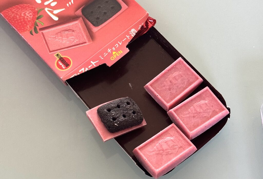 ストロベリーとラズベリーのパウダーを練り込んだチョコレートを全粒粉入りのココアビスケットと組み合わせられていて、甘酸っぱく美味しいです。