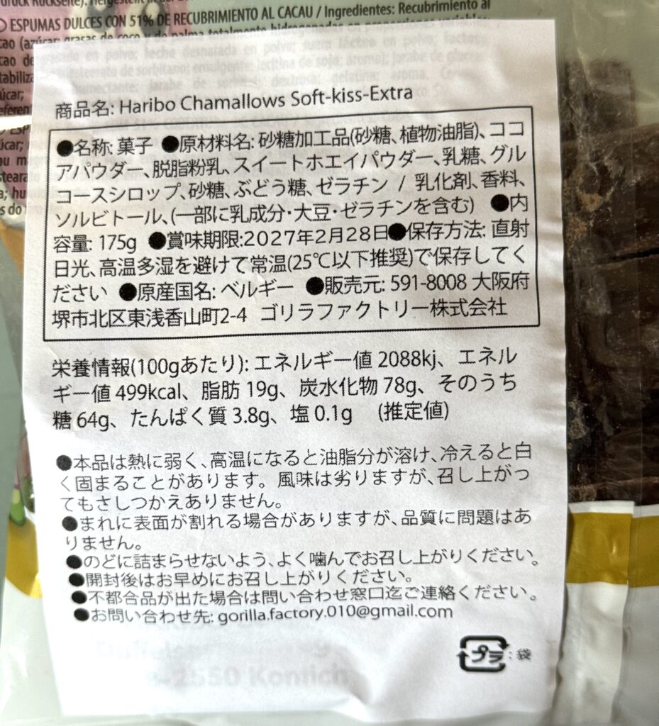 〈HARIBO〉チョコマシュマロ 原材料名・栄養成分表示