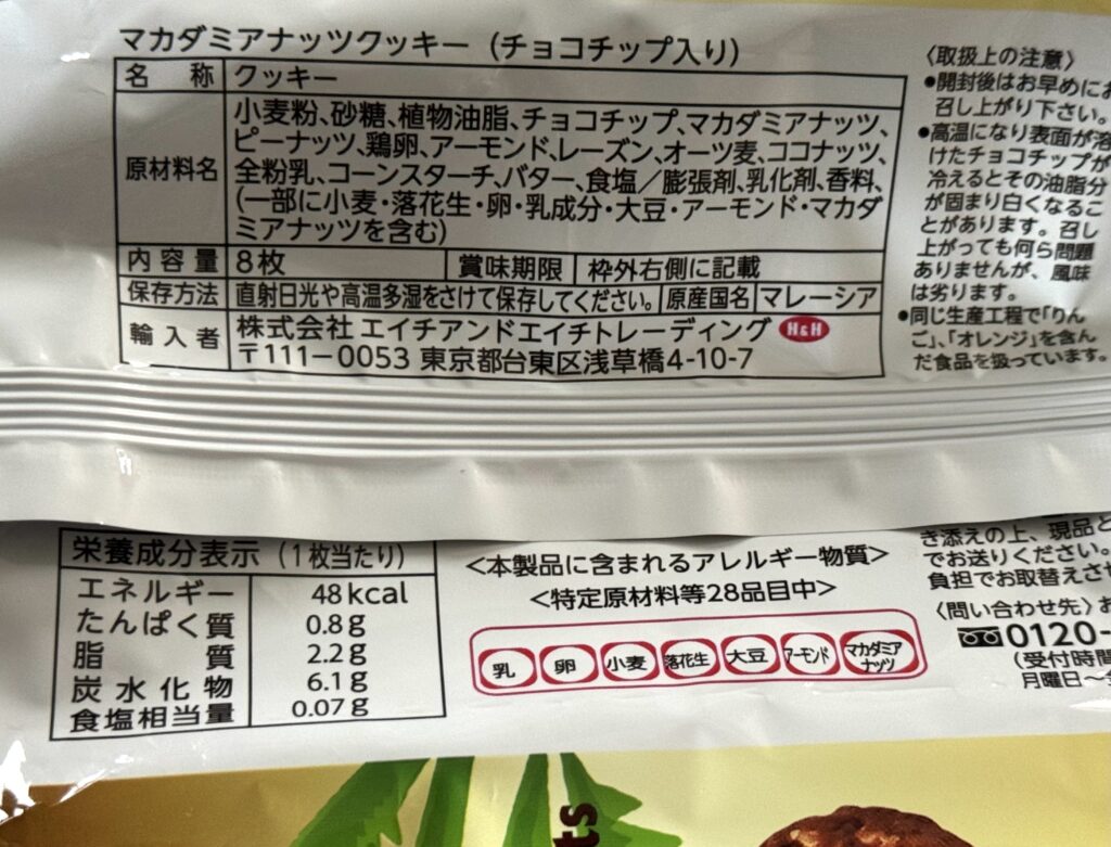 〈H&H〉マカダミアナッツクッキー チョコチップ入り 原材料名・栄養成分表示
