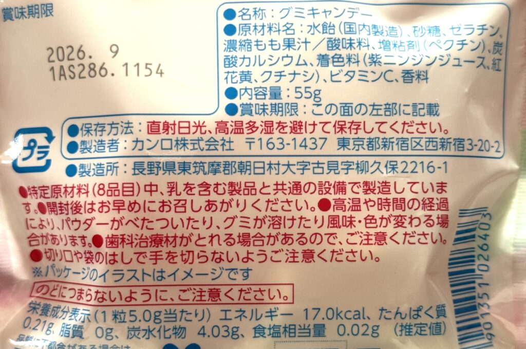 〈Kanro〉ピュレマロ! ピーチ味 原材料名・栄養成分表示