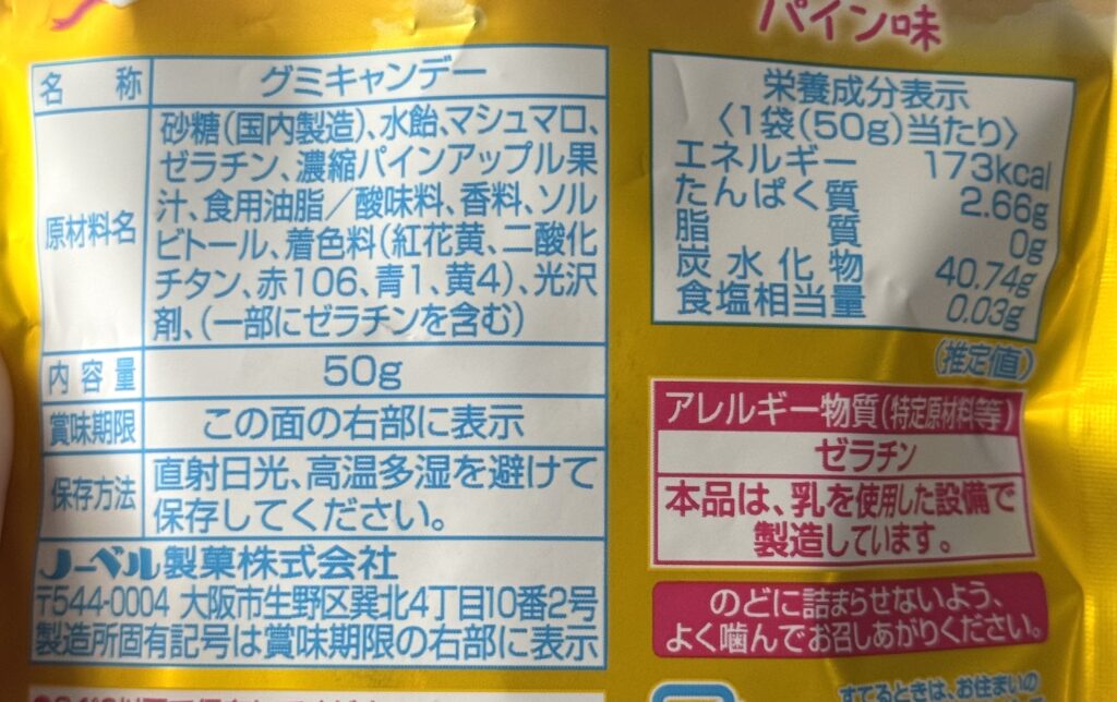〈ノーベル〉キラふわグミ ゴールデンパイン味 原材料名・栄養成分表示