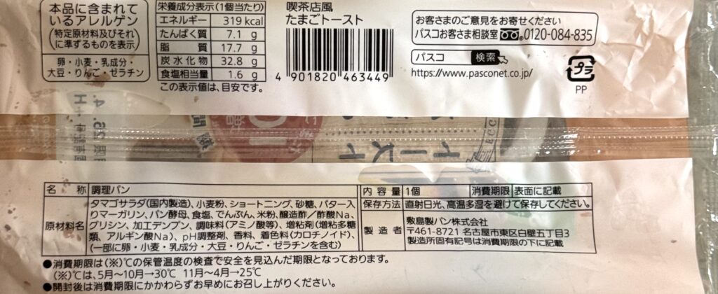 〈Pasco〉喫茶店風たまごトースト 原材料名・栄養成分表示