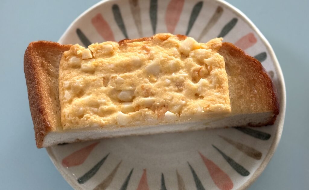厚ぎりの山型食パンにたまごサラダをのせて焼き上げられています。