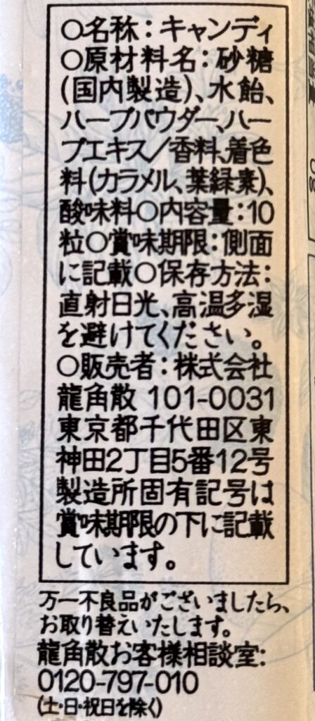 〈龍角散〉龍角散の のどすっきり飴 スティック 原材料名・栄養成分表示