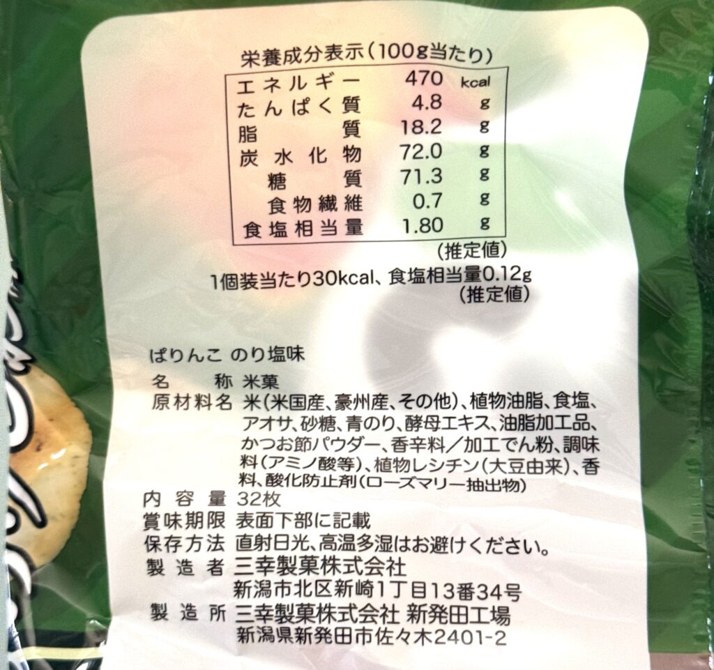 〈三幸製菓〉ぱりんこ のりしお味 原材料名・栄養成分表示