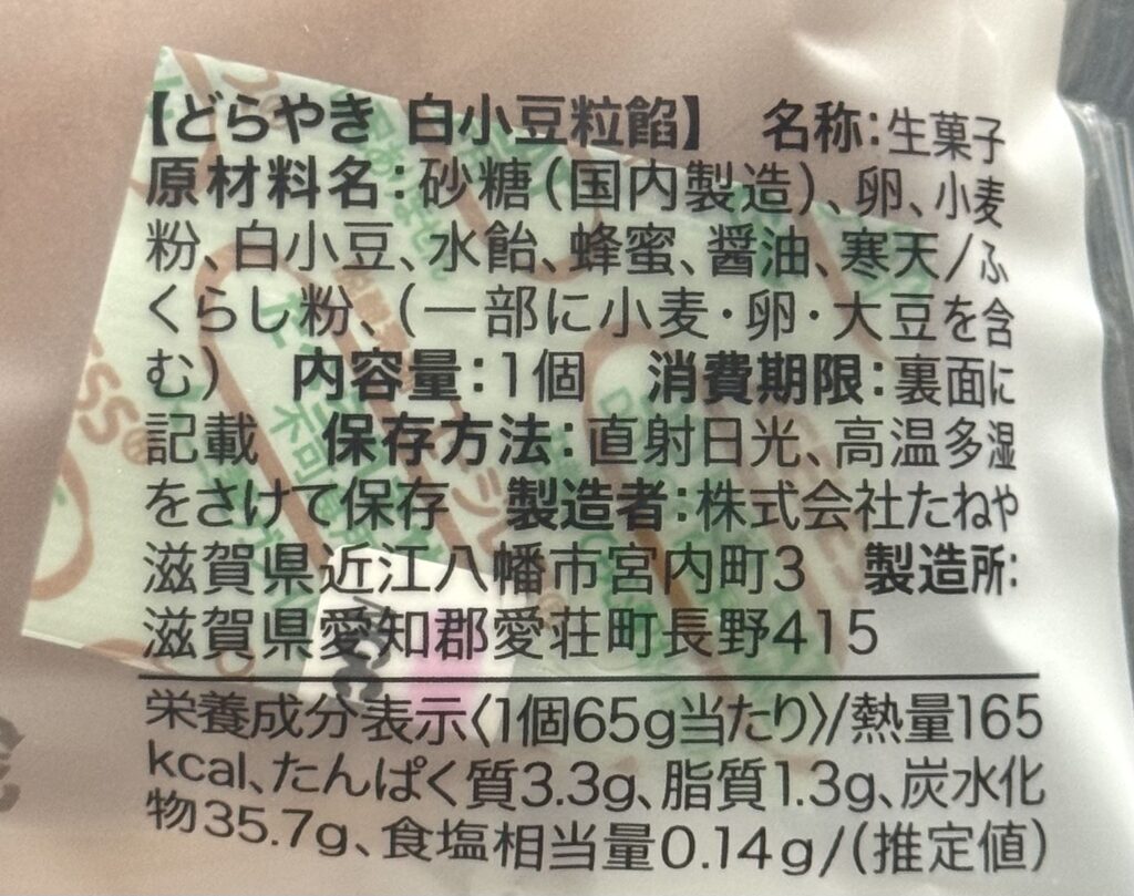 〈たねや〉どらやき 白小豆粒餡 原材料名・栄養成分表示