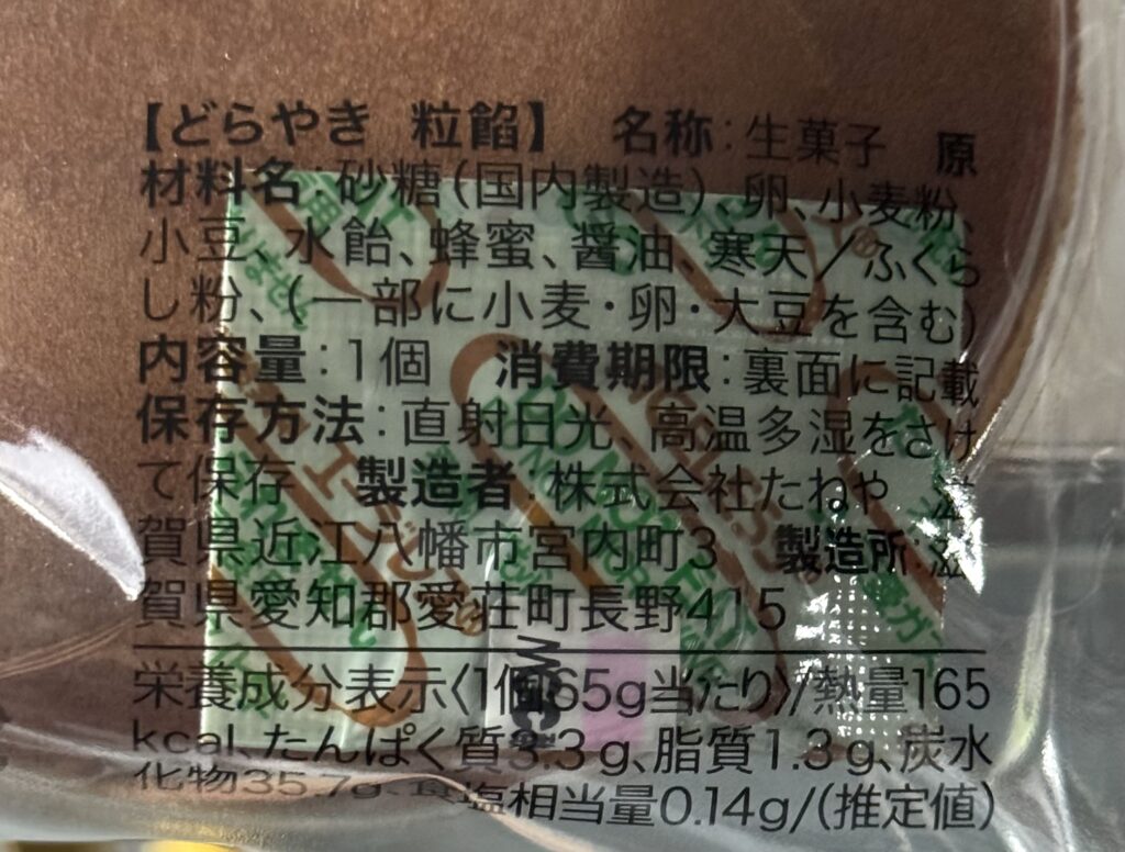〈たねや〉どらやき 粒餡 原材料名・栄養成分表示