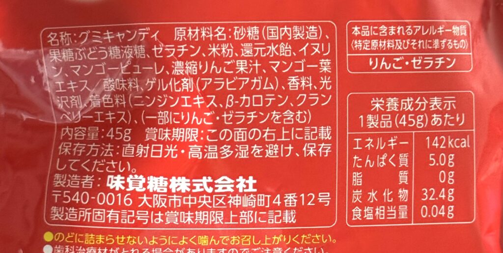 〈UHA味覚糖〉忍者めし鋼 マンゴー味 原材料名・栄養成分表示