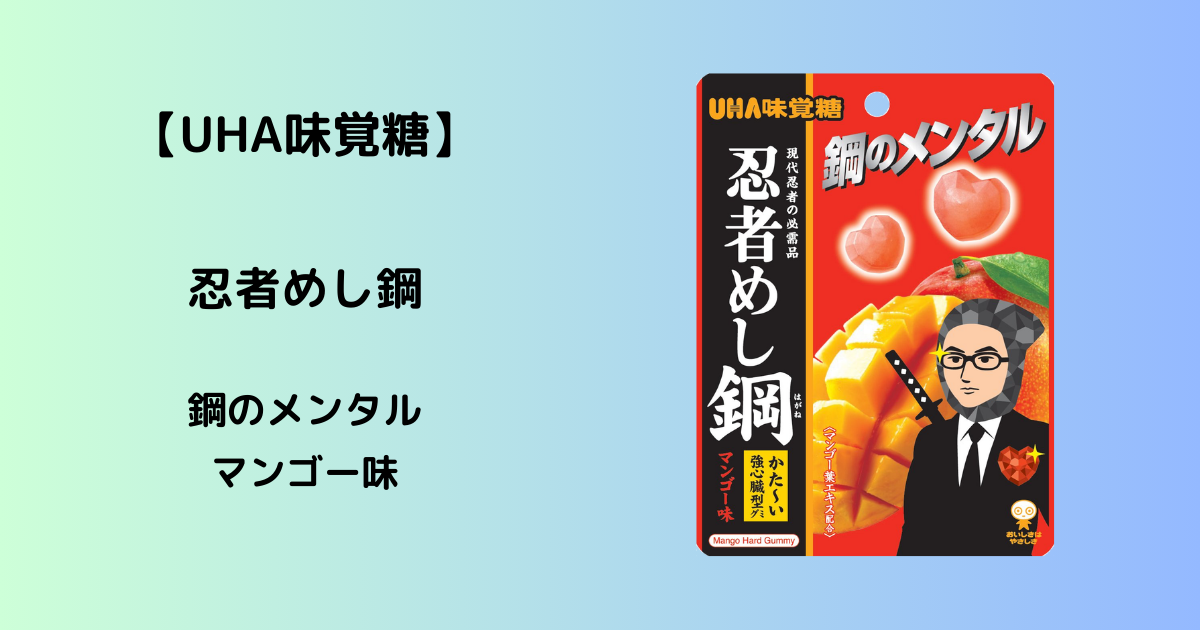 鋼のようなハードな噛み心地が特長の「忍者めし鋼」シリーズの新フレーバー、マンゴー味です。「鋼のメンタル」の名の通り、強心臓をイメージしたハート型グミです。